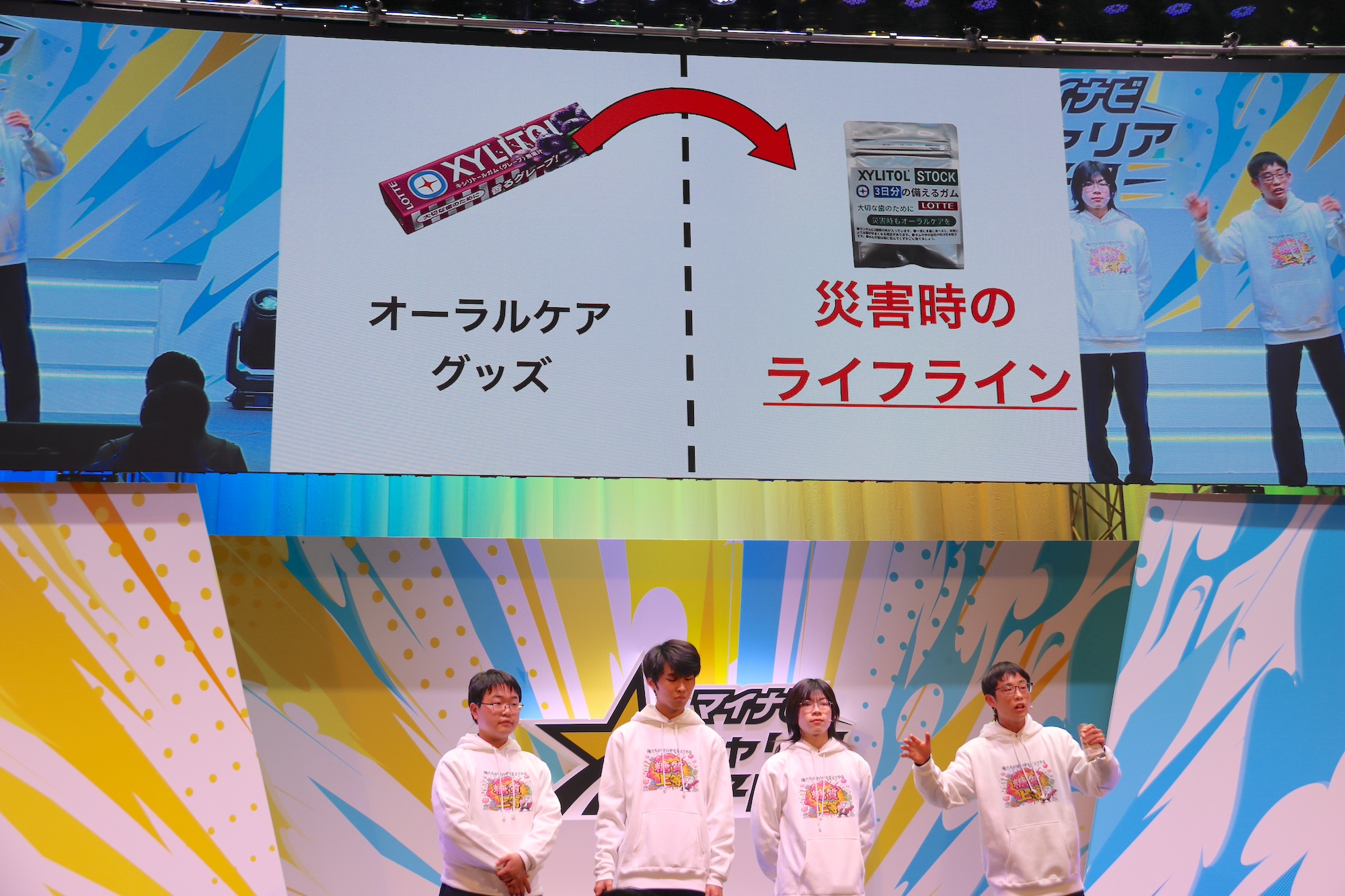 災害時のオーラルケアをテーマに、ガムを噛むだけで口内ケアを行える「XYLITOL STOCK(キシリトールストック)」を提案。