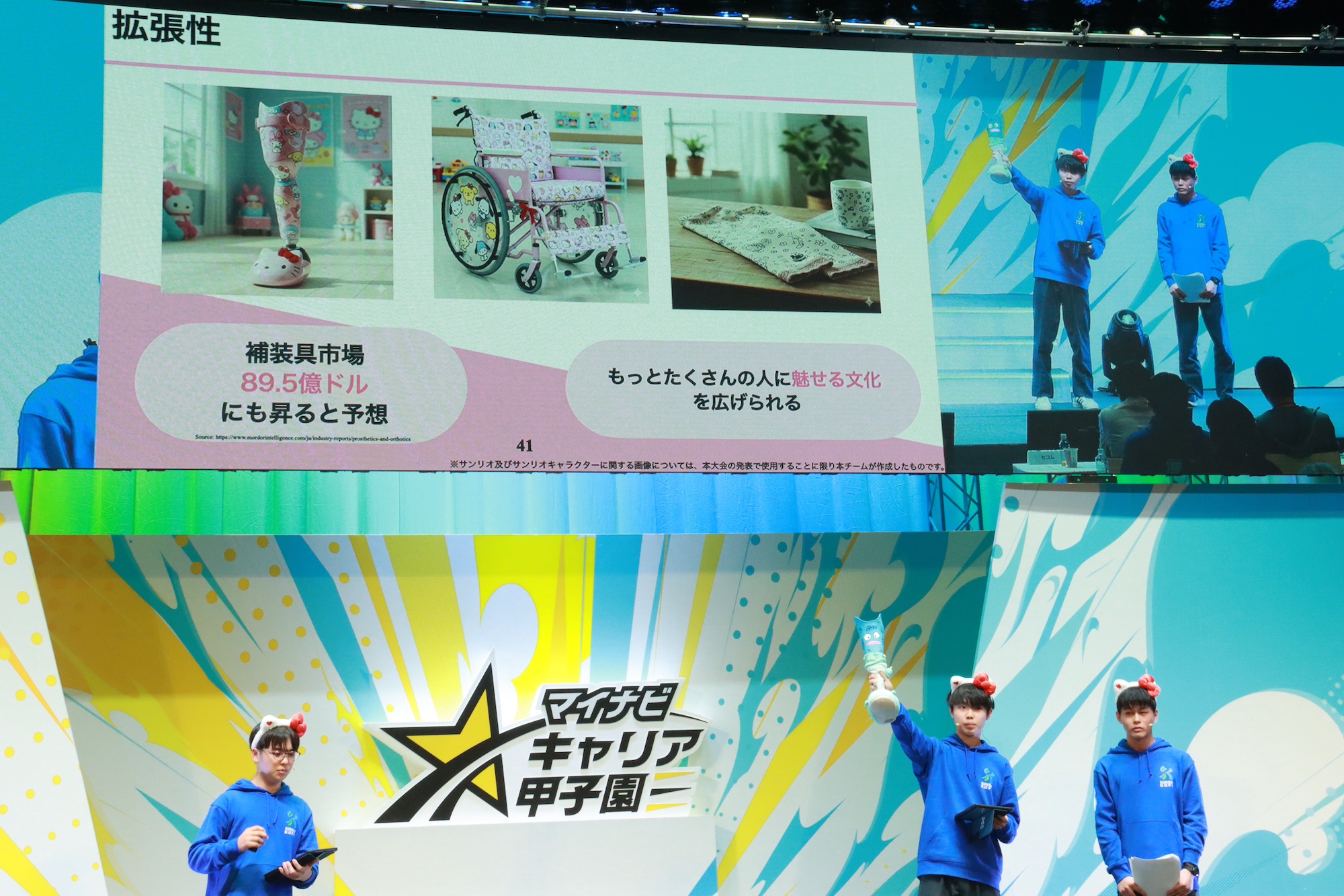 4チーム目のサンリオ代表「ボボボーンズ・ボーンズ」は、大衆向けの義肢義足に、サンリオの可愛いキャラクターをプラスするというアイデアを提案。