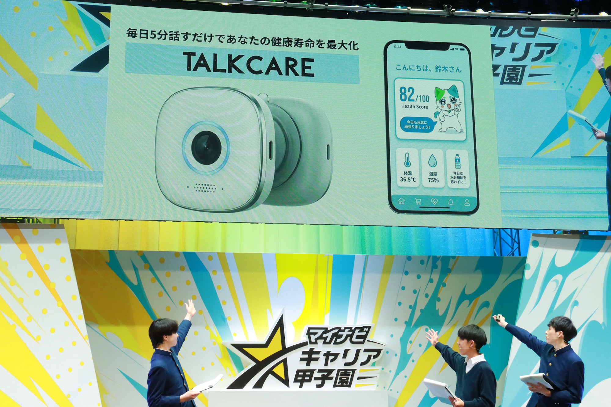 BandsMensは、自宅の洗面所の鏡に設置し、搭載されたAIと会話するだけでデータが専用アプリケーションを通して管理され、健康状態をアドバイスしてくれる「TALKCARE」をプレゼン。