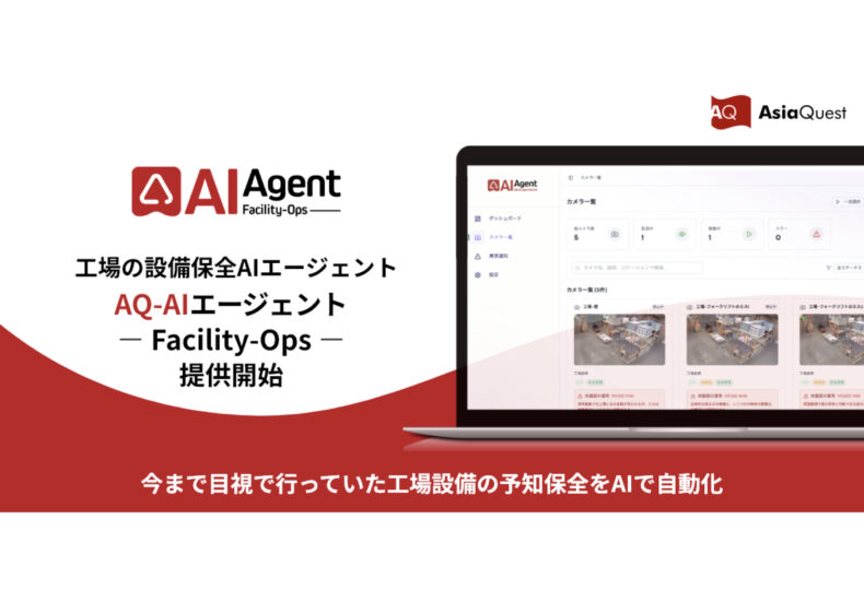 アジアクエスト株式会社は、同社が開発・提供しているAIエージェント搭載型業務効率化サービス「AQ-AIエージェント」シリーズにおいて、監視カメラ映像の解析AIとAIエージェントが連携し、設備保全における検知から判断まで”を自動化する新サービス「AQ-AIエージェント Facility-Ops」の提供を開始したことを発表した。