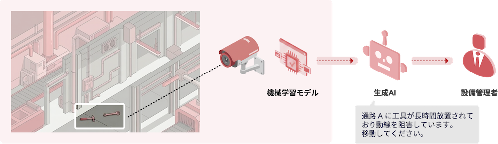「AQ-AIエージェント Facility-Ops」は、既存の監視カメラ映像を活用し、AI(機械学習モデル)が設備や作業環境の状態変化を検知。