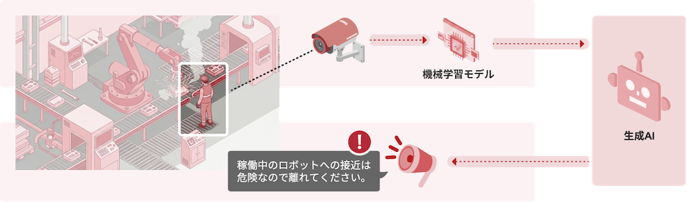 また、稼働中のロボット周辺や立入禁止区域への人の侵入を検知し、即座に警告を行うことで労働災害のリスクを低減したり、ヘルメットや安全ベストなどの保護具着用状況を確認し、心理的な反発を招かない「見守り型」の安全管理の実現なども可能となる。
