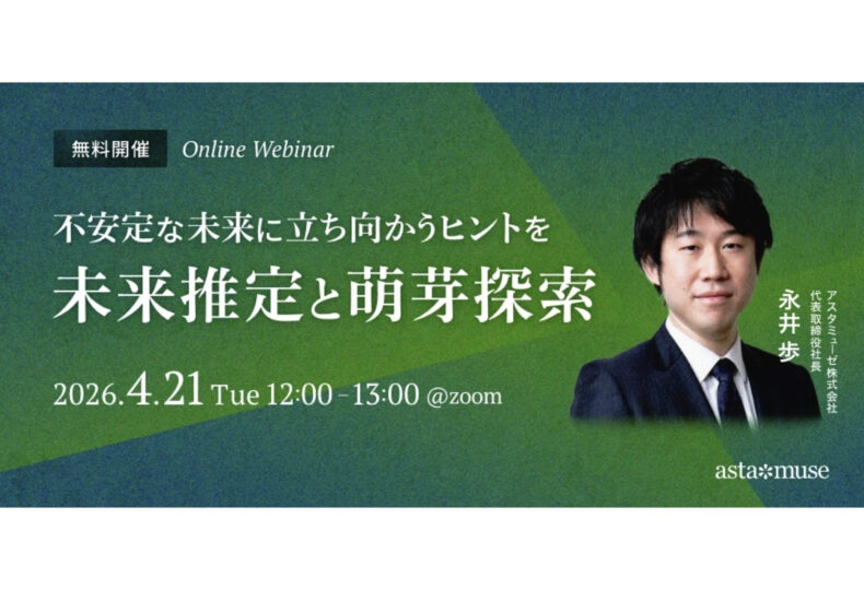 アスタミューゼ株式会社は2026年4月21日 12時より、無料ウェビナー「不安定な未来に立ち向かうヒントを ~未来推定と萌芽探索~」を再開催することを発表した。