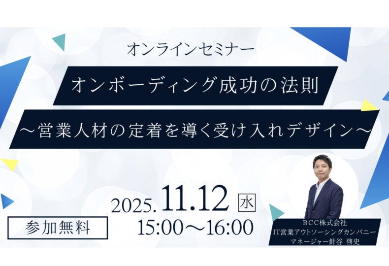 BCC株式会社は、営業部門における人材定着と早期戦力化をテーマにしたオンラインセミナー「オンボーディング成功の法則 〜営業人材の定着を導く受け入れデザイン〜」を、2025年11月12日に開催することを発表した。