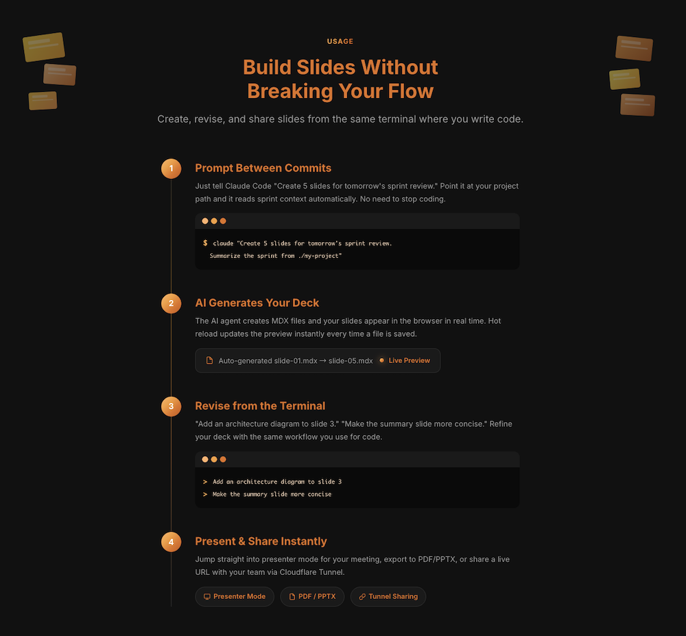 つまり、開発者は今使っているターミナルから一歩も離れることなく、開発の合間にスライドを作り、ブラウザでプレビューしそのまま会議に臨めるのだ。
