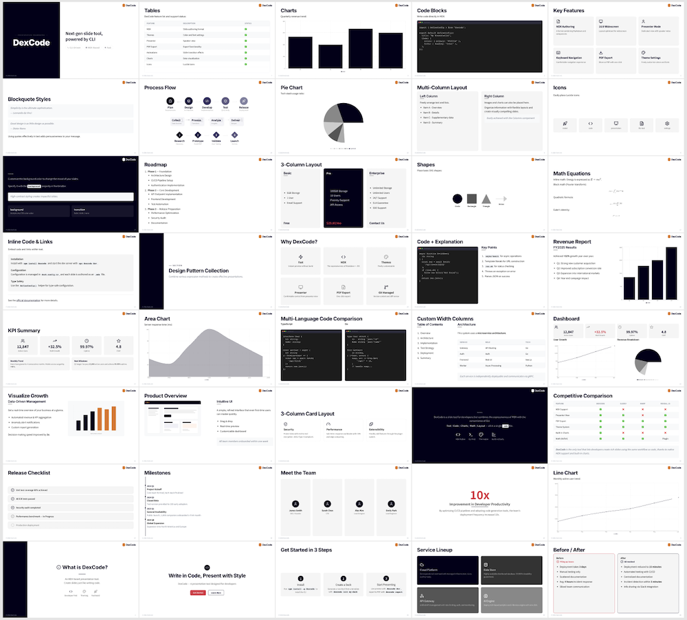 DexCodeはこの環境に着目し、スライドの中身をMDX(Markdown + JSX)で記述する設計にすることで、AIコーディングエージェントがコードを書くのとまったく同じ操作で、スライドの生成・編集ができる仕様。