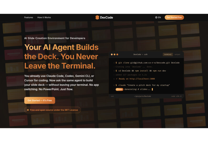 同社が公開したDexCodeは、開発者がClaude CodeやCodexをターミナルで使って開発作業を行っている最中、同じ環境のまま、隣のウィンドウでスライド資料も同時に作成できるスライド作成環境だ。