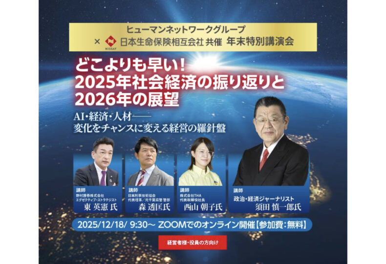 中小企業の財務強化・事業承継・相続対策を支援しているヒューマンネットワークグループは、全国の中小企業経営者・役員の方を対象とした年末特別講演会「どこよりも早い!2025年社会経済の振り返りと2026年の展望」を、2025年12月18日にオンラインにて開催する。