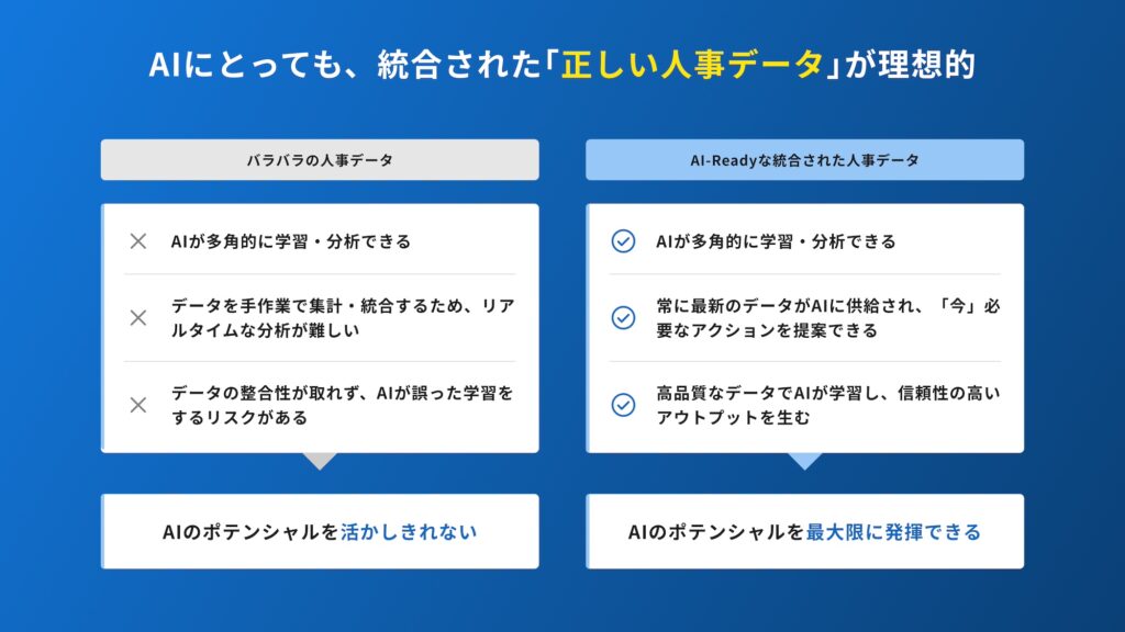 これらの情報は日々変化するため、常に最新の状態へ更新されていることが求められ、AIエージェントが参照するデータそのものが「正しい人事データ」として整備されているかどうか、そしてそのデータが「過去」「現在」「未来」の3つの時間軸で正確に活用できるかどうかが、AIの成果を左右する鍵だ。