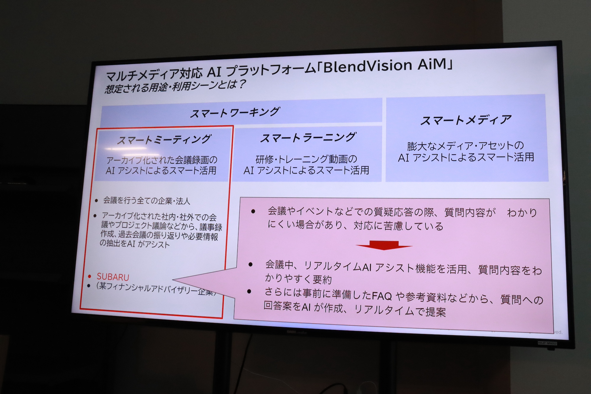 そこで、動画配信事業者や一般企業向けに、長年提供してきた動画配信サービスで培ったノウハウ・技術だけでなく、昨今躍進を遂げているAIの活用技術を融合させ、従来のテキスト情報に加えて、企業における会議の録画や研修・トレーニング動画、企業・官公庁が提供している様々な情報や動画マニュアル、教育機関などが提供するオンライン講習、メディア業界における動画資産の効率良い活用などをアシストしてくれるサービスが、このBlendVision AiMだ。