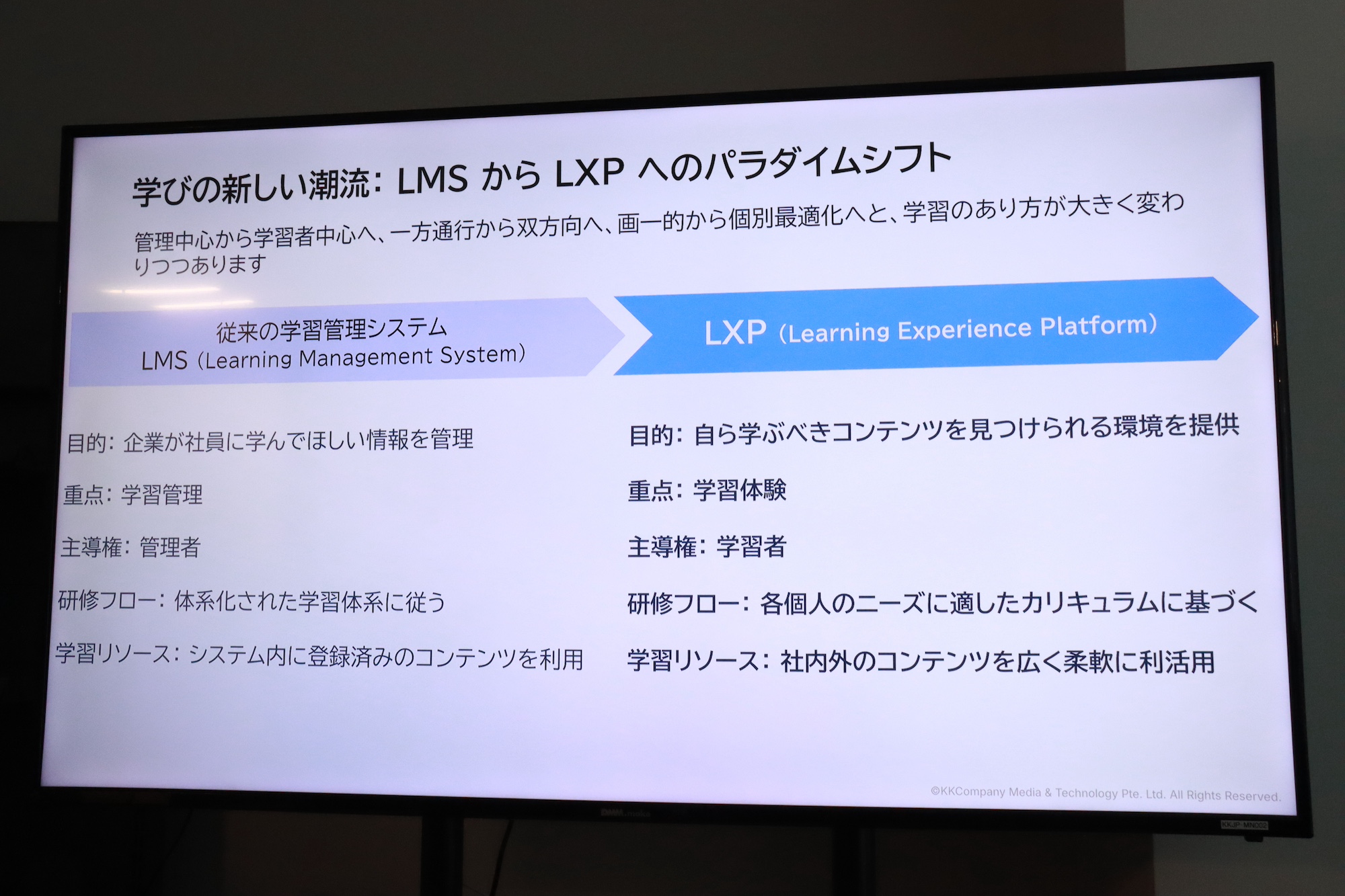 今回KKCompanyがリリースしたスキルアップ・サプリは、同社が動画技術とAIをeラーニングに活用することで、社員一人ひとりの自律的な学習を促し、学習者の興味や将来のキャリアパスをサポートする「LXP(Learning Experience Platform -学習体験型プラットフォーム)」となっている。