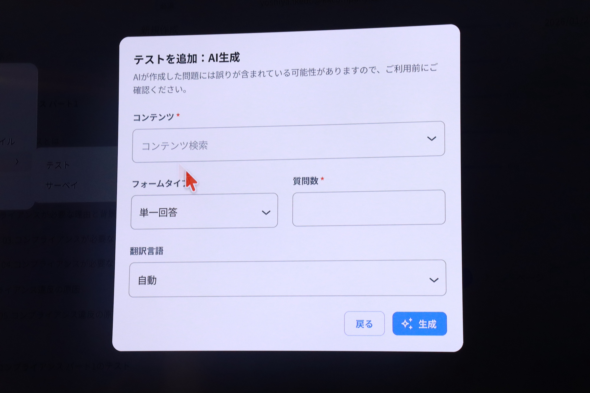 さらに、この研修は動画の流し見などのサボり防止のため、最後にテストが出題されるようになっているが、その問題の作成・採点などもAIで簡単に行うことが可能だ。