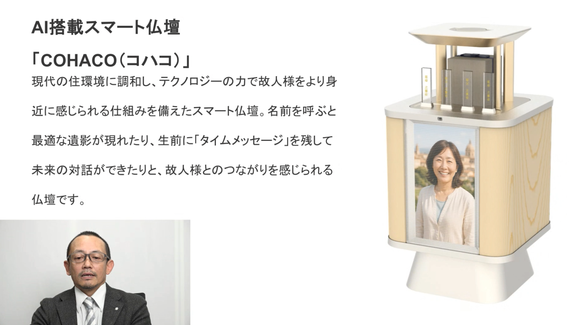 代表的なサービスとして、バーチャルAI故人サービス「Revibot(レビボ)」や、AIを搭載したスマート仏壇「COHACO(コハコ)」、写真を音楽・AIなどで動画化するメモリアルムービー「My self history(マイセルフヒストリー)」などを紹介した。