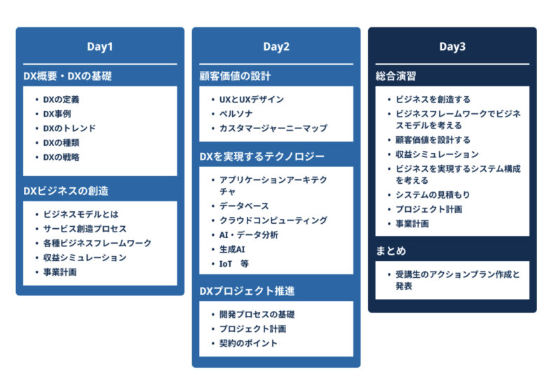 業務改革DXだけでなく、新規サービスの企画方法やビジネスモデルの評価法なども含む、DXの全体像を体系的に学べるプログラム