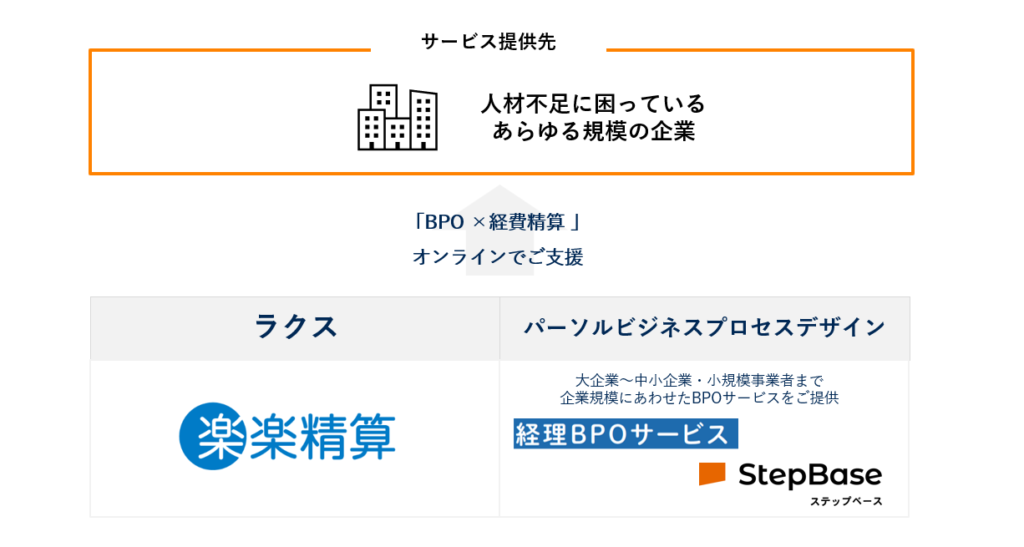 一方で中堅・中小企業向けには、パーソルビジネスプロセスデザインが提供する中小企業向けBPOサービス「StepBase」において、ラクスの「楽楽精算」を組み込んだパッケージを新たに提供開始予定。