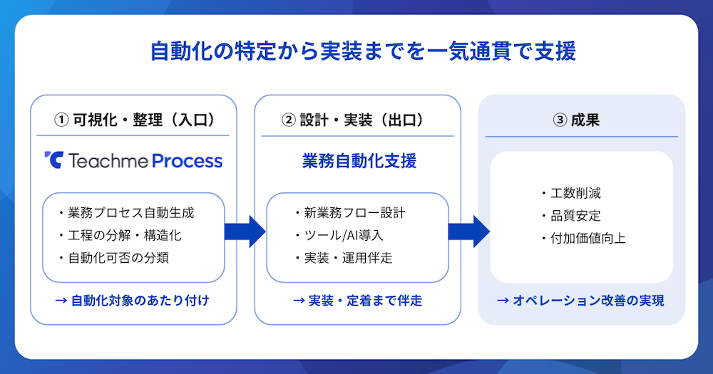 Teachme Processで業務の全体像を可視化・整理したうえで、業務自動化支援で新業務フローの設計・実装へと移行することで「どこを自動化するか」と「どう自動化するか」をセットで進めることが可能。