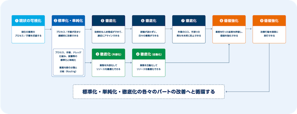 具体的には、業務の可視化・標準化・単純化・徹底化のステップを通じて、筋肉質な組織を目指し、最終的にコア業務に注力できる体制構築を支援。