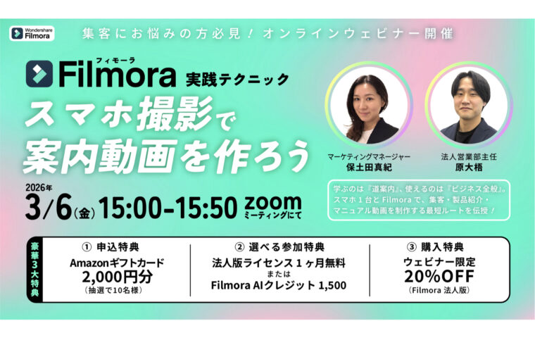 IT・テクノロジー ワンダーシェアーソフトウェアが集客力を高める「案内動画」の作り方を実演するオンラ... 株式会社ワンダーシェアーソフトウェアは、動画編集ソフト『Filmora(フィモーラ)』を活用し、未経験からでも即実践でき...