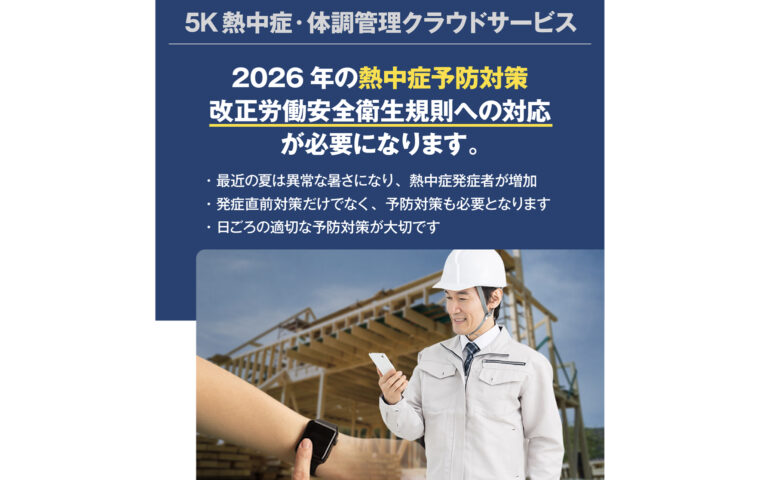 IT・テクノロジー 5Kサポートが提供する「5K熱中症・体調管理クラウドサービス」大手ゼネコンでテス... 5Kサポート株式会社は、同社が提供する提供する「5K熱中症・体調管理クラウドサービス」について、今季の繁忙期を前に引き合...