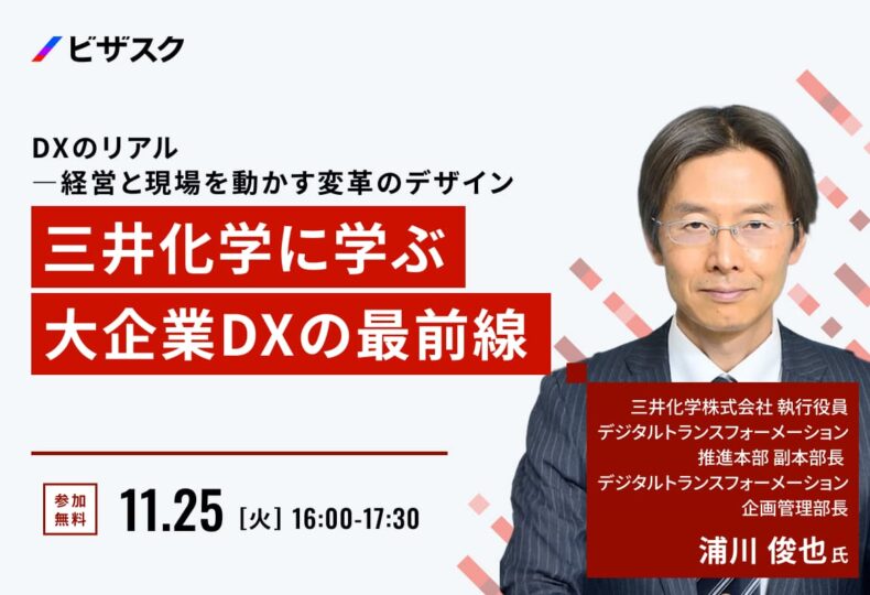 「知見と、挑戦をつなぐ」をミッションにグローバルなナレッジプラットフォームを運営する株式会社ビザスクは、この度『三井化学に学ぶ、大企業DXの最前線』をテーマに、三井化学株式会社 執行役員 デジタルトランスフォーメーション推進本部 副本部長 デジタルトランスフォーメーション企画管理部長の浦川俊也氏が登壇する無料オンラインセミナーを、11月25日16時より開催することを発表した。