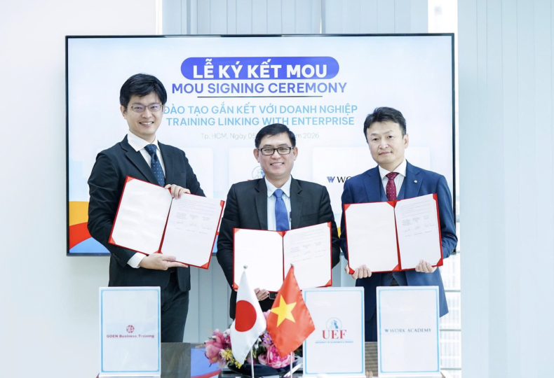 日本の大学教育機関向けにキャリアプログラムを提供する株式会社ワークアカデミーは、ベトナムの主要大学であるホーチミン市経済金融大学(以下「UEF」)および現地教育研修機関のGOEN Business Training(以下「GOEN」)と、教育・イノベーション・人材育成に関する三者間覚書(MOU)を締結した。